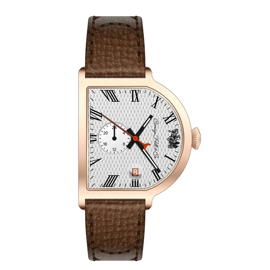 A polished rose gold-tone dress watch with a textured white dial, black Roman numerals, and bold orange seconds hand. Finished with a brown calfskin leather strap, it offers a modern twist on timeless Carriage Hill & Co. design.