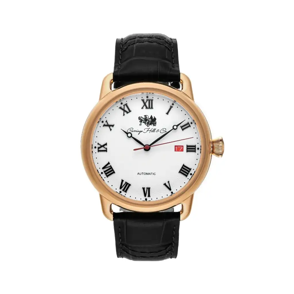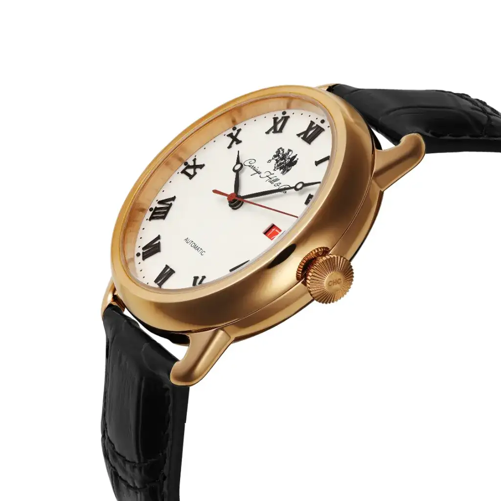 The Honorable Rose brings warmth and balance to classic design. A white dial with black Roman numerals and a red date window sits within a rose gold-plated case. Paired with a black calfskin strap and powered by automatic movement, it’s a watch for those who lead with elegance, not volume.