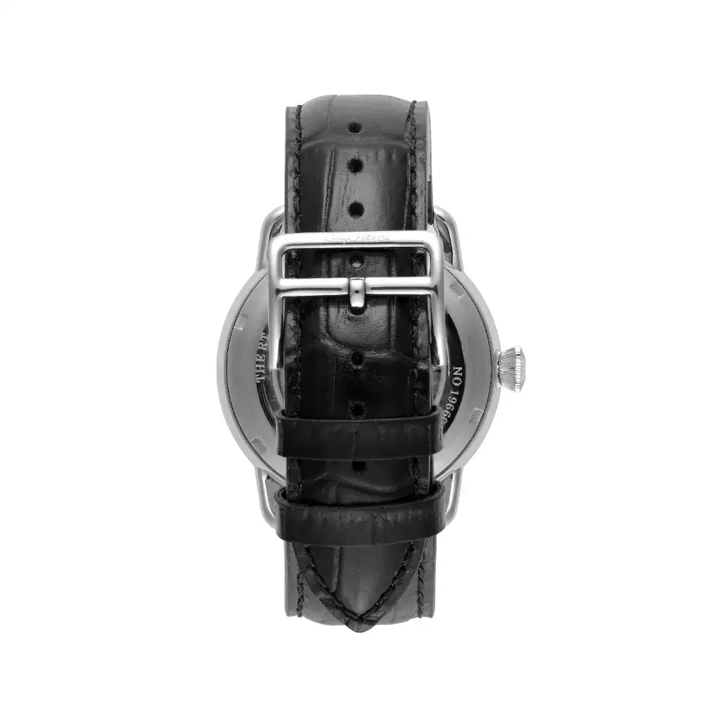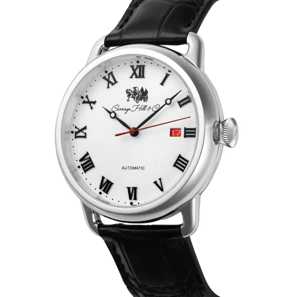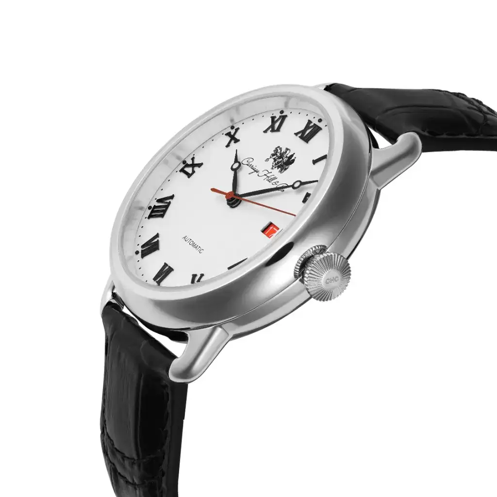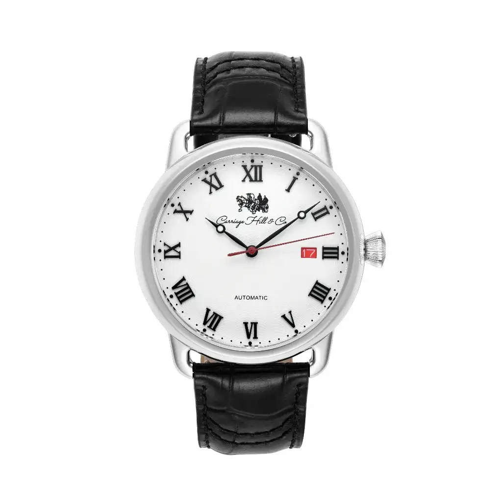 The Honorable White reflects clarity of purpose. A polished silver case frames its white dial, featuring black Roman numerals and a red-accented date window. With an automatic movement and black leather strap, this watch is timeless in appeal—designed for those who prefer elegance in its purest form.